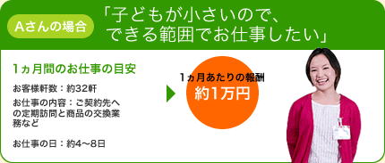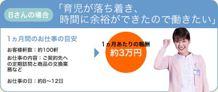 訪問の日時やルートを工夫して効率的にまわったり、自分が良いと思う商品を、主婦ならではの使用実感を交えておすすめしたり。 そんなふうに自分なりにいろいろ工夫してみて、結果が良ければ、うれしくてもっと工夫するようになって、どんどんおもしろくなるんです。